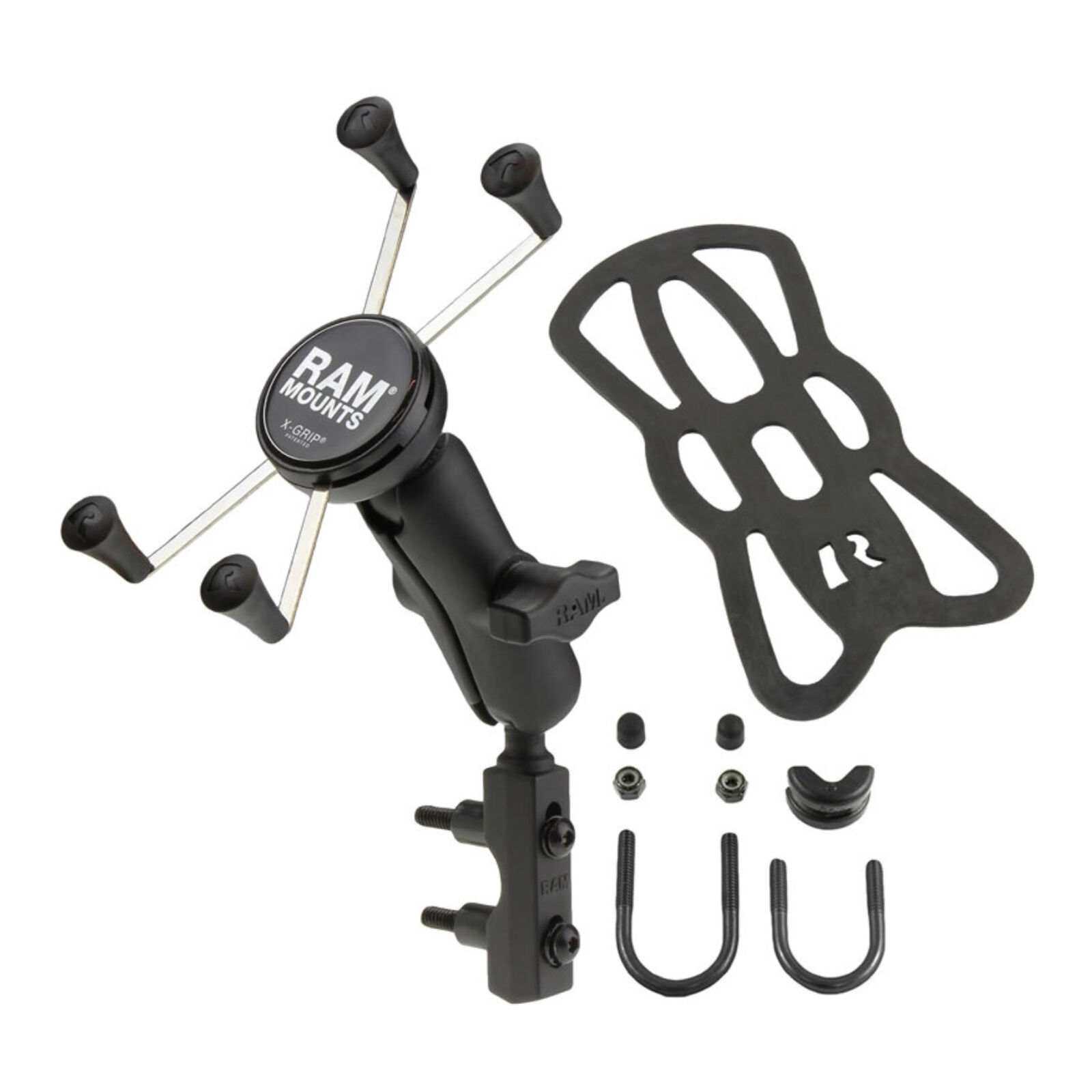 The RAM-B-174-UN10 consists of hardware for mounting to either brake/clutch reservoirs and rails that are 0.5 to 1.25 in diameter a double socket arm and a universal X-Grip® large phone/phablet holder. Designed into the mount is a 1 diameter patented rubber ball and socket system with adjustment points at both ends of the socket arm; this with a twist of the arm knob allows you to move the X-Grip® mount to your optimum viewing position. The mounting hardware for brake/clutch reservoirs includes both standard and metric mounting bolts. The included X-Grip® cradle has a clean and clever four-leg design that sports great holding power without hiding your phone behind foam pads and plastic. The spring-loaded X-Grip® cradle expands and contracts allowing for a perfect custom fit for your cell phone. The perfect complement to the modern sleek interior of today's vehicles the RAM X-Grip® is the cell phone cradle evolved. The X-Grip® includes a device tether recommended for outdoor applications. The cradle is compatible with handheld devices that will fit the dimensions listed below. It is important to verify the dimensions of your handheld device with a case/sleeve/skin when determining the overall size.