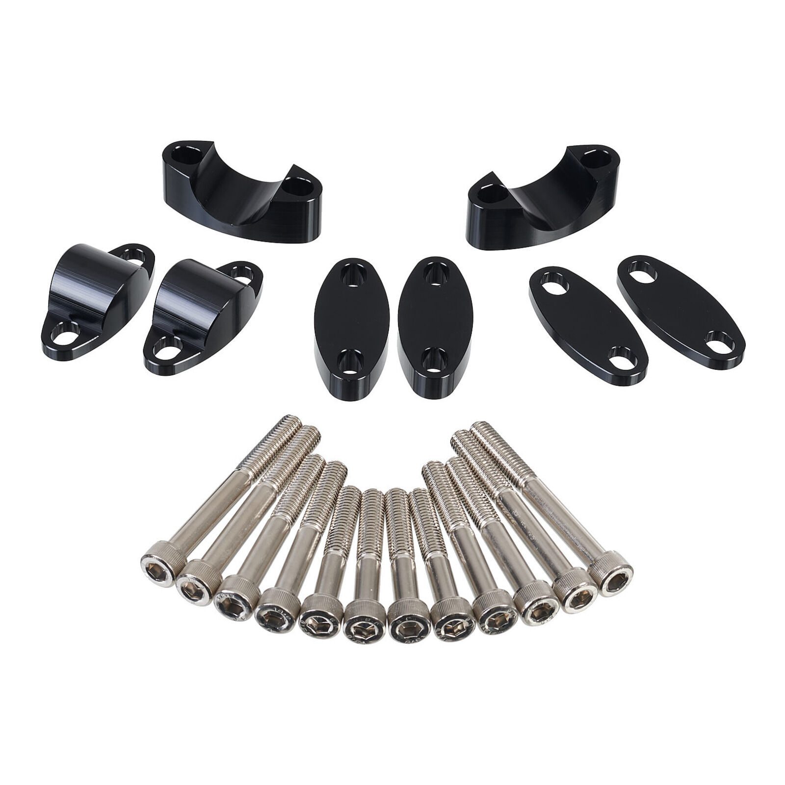 This kit includes four different spacers giving different height rising options (10mm 15mm 20mm 25mm Max 40mm) while also including three different length M8 fitting bolts the height risen determines the bolts required for mounting.