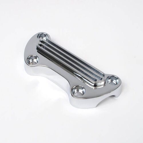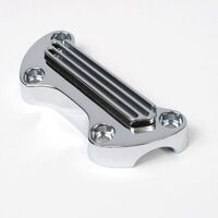 The Whites 1-Piece Finned Top Bar Clamp is the perfect addition to your cafe racer or bobber project or an upgrade for your existing ride. Constructed from chrome plated steel for excellent strength, durability and corrosion resistance while providing a show chrome shine. The clamp is manufactured with countersunk bolt holes to improve the look of your handlebar set up and is compatible with 1" handlebars.